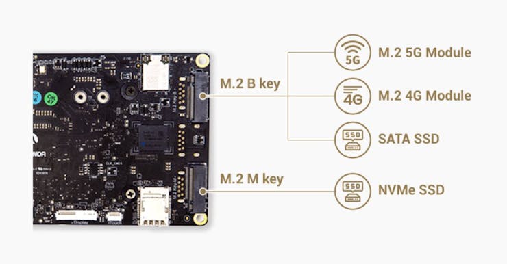 1x M.2 B Key (PCIe 3.0 x1, USB 2.0/3.0, SATA, SIM – supports 4G/5G modules)