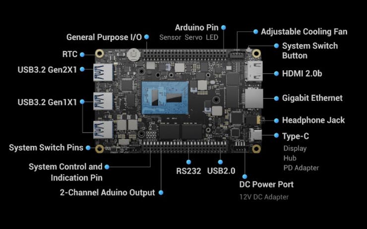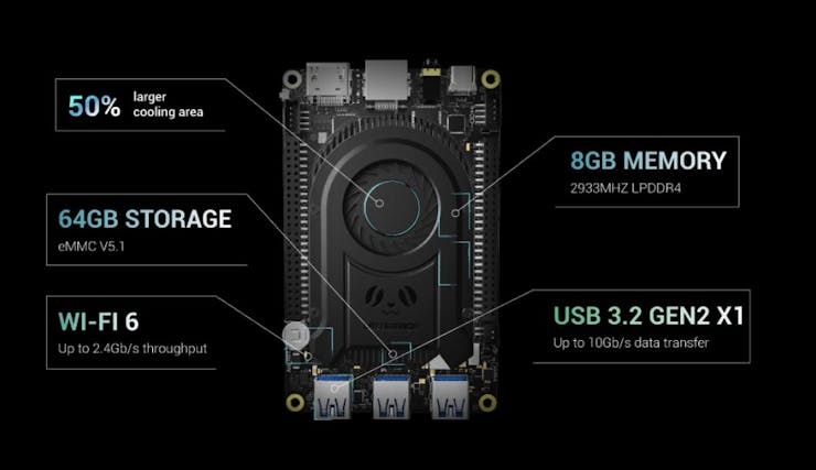 This board is equipped with 8GB of LPDDR4 RAM running at 2933MHz and offers 64GB of onboard eMMC storage, which is more than sufficient for lightweight to moderately heavy tasks.